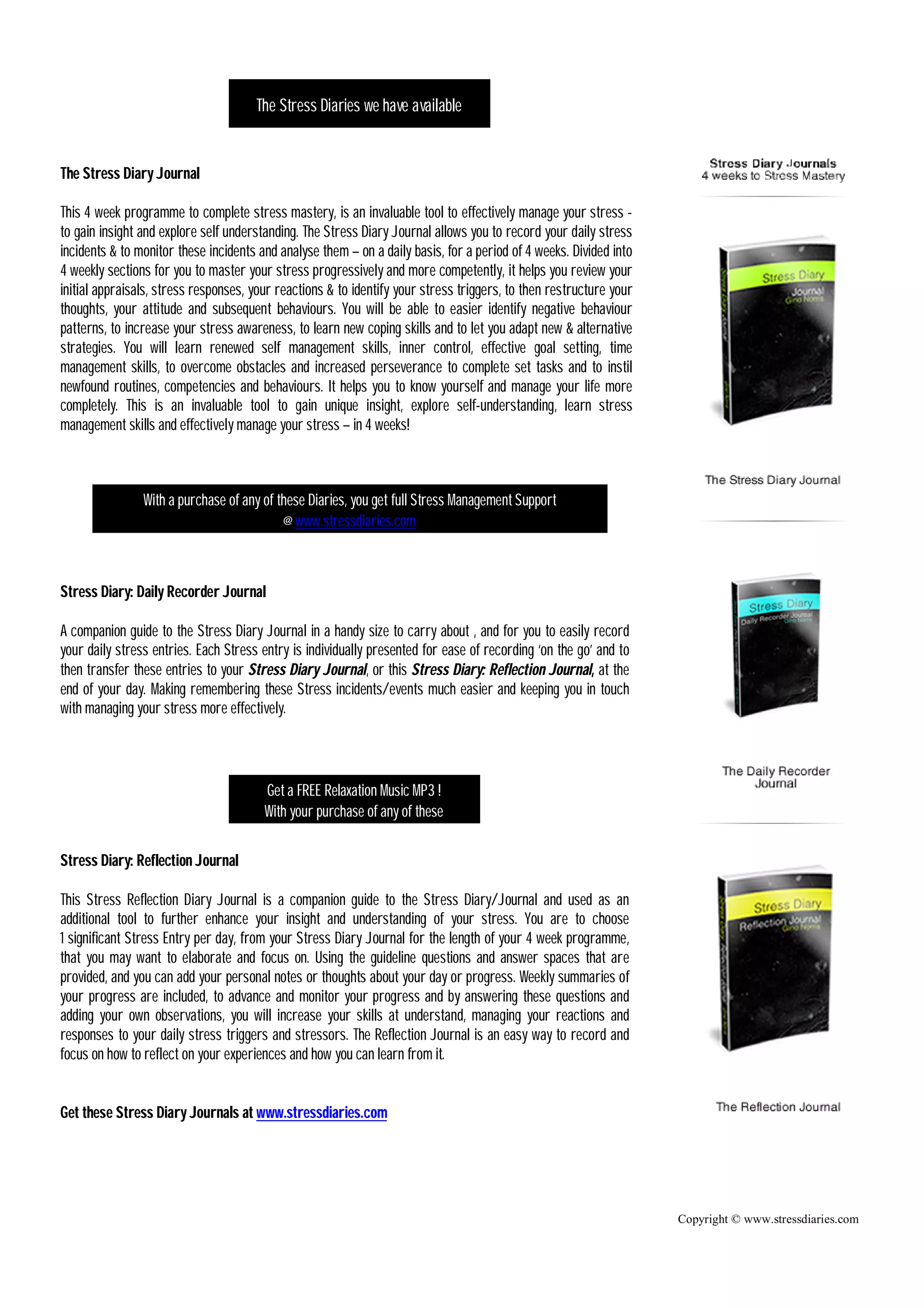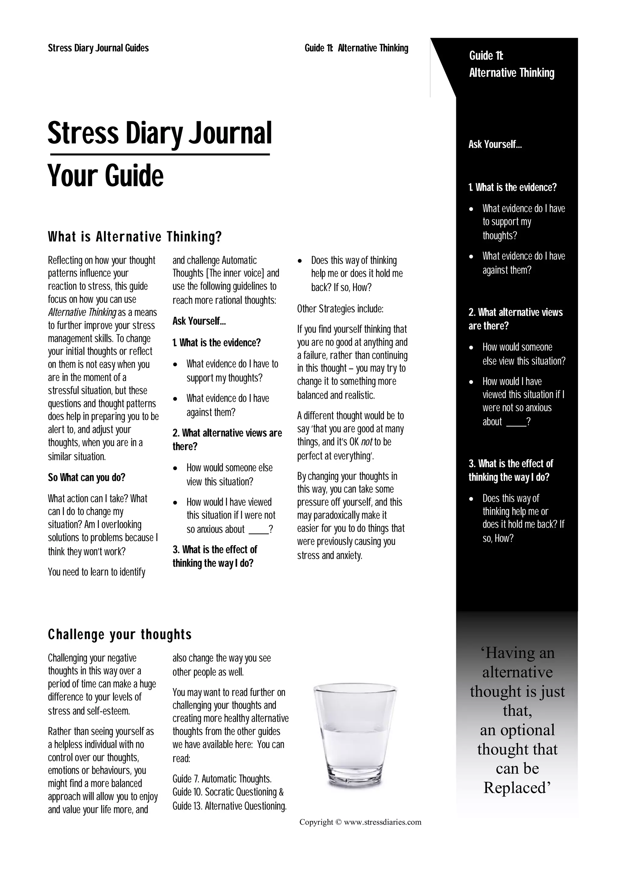 This document provides guidance on using alternative thinking to manage stress. It recommends asking yourself questions to challenge automatic negative thoughts, such as what evidence supports or counters your thoughts and considering alternative views of the situation. Alternative thinking can help reduce stress and improve self-esteem by replacing unhelpful thoughts with more balanced perspectives. The document also advertises stress diary journals and reflection journals to help users record daily stressors, monitor progress, and develop stress management skills over 4 weeks.