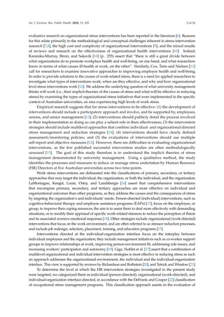 This document summarizes a qualitative study that investigated stress intervention strategies implemented at five Australian universities over three years. The study aimed to understand the types of interventions used and the level (individual, organizational, or both) they were directed at. It also explored the priority initiatives at each university. Senior HR directors from the universities completed an online survey identifying stress reduction strategies in areas like awareness, job design, work-life balance, and communication. The interventions focused mainly on organizational-level primary strategies to reduce or eliminate stressors, like improving training, career development, pay, and fairness of policies. Enhancing work-life balance and leadership development programs were also common. The findings provide insight into university management's views of work stress causes