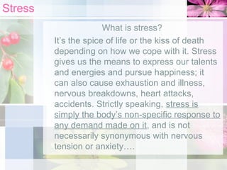 The document provides information about stress, anxiety, relaxation techniques, and tips for managing stress and getting better sleep. It discusses that stress is the body's response to demands and can have both positive and negative effects depending on how one copes. Anxiety is a lingering feeling of apprehension that is often from an unknown source. Fundamentally, how one interprets and reacts to stressful situations matters more than the situations themselves. The document then gives various tips for reducing stress through relaxation, communication, organization, and lifestyle changes. It also provides details on relaxation techniques like meditation, imagery, diaphragmatic breathing and the quieting reflex.