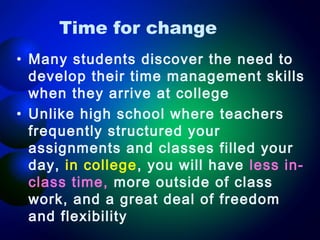- Poor time management can lead to stress as students have less structured time in college compared to high school. Managing time effectively is important for success.