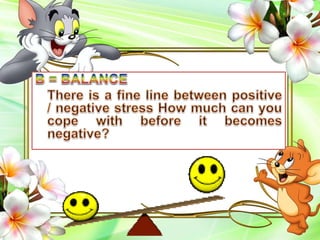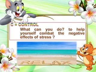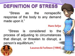 This document discusses different perspectives on stress from various authors and researchers. It defines stress as the body's nonspecific response to demands or as adjusting to disruptions. There are two main types of stress: eustress (positive stress) and distress (negative stress). Examples of each type are provided. According to Lazarus, there are several categories of stress including work, family, chronic, acute, daily hassles, trauma, and crisis. The document also provides many strategies for managing stress, such as being aware of stressors, relaxation techniques, social support, humor, problem reframing, time management, and objective problem solving.