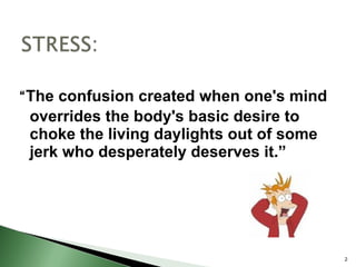 The document summarizes a talk on stress management techniques. It discusses common stress symptoms, statistics on stress-related health issues and costs in the US. It then outlines various myths about stress reduction and presents simple techniques like deep breathing that can be done anywhere to lower stress. These techniques are said to be effective in reducing stress, depression, pain and other issues. The talk encourages sharing stress reduction with others and dedicates just 10 minutes daily to benefit from the methods.
