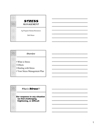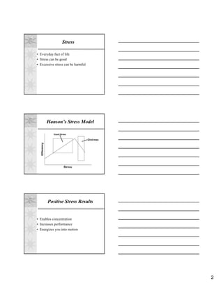 This document provides an overview of stress, its effects, and ways to manage it. It defines stress as our response to challenging situations and discusses Hanson's stress model of positive and negative stress. Positive stress can increase performance while excessive negative stress can harm physical and mental health. The document outlines common physical, mental, and behavioral signs of stress and recommends identifying stressors and developing a stress management plan using techniques like deep breathing, exercise, and time management.