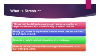 The document discusses stress as a physical and emotional response to challenges, highlighting that not all stress is harmful; moderate stress can enhance performance. It categorizes stress into positive (eustress) and negative (distress), detailing symptoms and various stressors, both internal and external. Finally, it offers strategies for stress management, including engaging in physical activity, altering stressful situations, and adopting a healthy lifestyle.