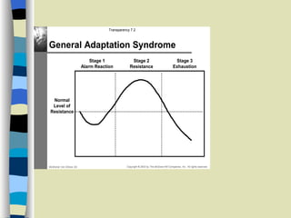 The document discusses stress, its sources, effects, and management. It defines stress as emotional and physiological reactions to demands from within or outside an organization. Sources of stress include work-related factors like role conflicts and responsibilities, as well as non-work stressors like daily hassles. Effects of stress can be physical like heart disease, behavioral like smoking, or psychological like depression. Individual differences in resilience to stress exist. Stress management involves personal lifestyle changes like exercise and diet, as well as cognitive techniques, organizational strategies, and principles like becoming aware of stress perceptions.