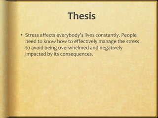 This document summarizes stress management techniques. It defines stress and discusses its origins and types. Examples of stress include behavioral, physical, emotional and mental stress. The document outlines the fight or flight response and stages of stress. It then provides methods for managing stress such as meditation, exercise, laughter and optimism. Statistics about stress are also presented along with effects on health and relationships.