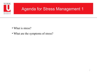 This document provides information about stress management. It begins with an agenda that outlines discussing what stress is and symptoms of stress. It then includes a stress quiz where participants rate statements about lifestyle habits and stress levels. The document discusses interpreting stress quiz scores and areas of life that stress can impact like the mind, body, and behavior. Participants are prompted to identify their own stressors and how stress affects them. The goal is for readers to understand what stress is and how it can impact health in order to better manage stress.