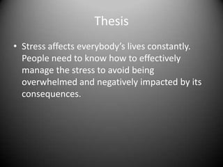 Stress affects everyone and needs to be effectively managed to avoid negative consequences. Stress was first conceptualized in the 19th century and is defined as any demand placed on the body. The fight or flight response is the body's instinctual reaction to stress. Stress has physical, psychological, and behavioral effects and builds up over time if not managed properly. While some stress can be positive, too much stress weakens the immune system and increases health risks. Managing stress requires techniques like breathing, exercise, meditation, and optimism.