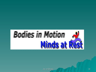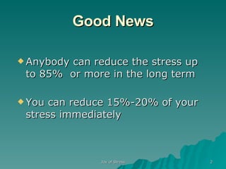 This document provides 35 tips for managing stress in the short term. Some of the key tips include engaging in physical activity, deep breathing exercises, getting enough sleep, spending time on hobbies, learning to accept things that are outside of one's control, and seeking professional help if stress becomes unmanageable. The document emphasizes that stress is a normal part of life but that too much or too little stress can be harmful, and recommends finding a stress management strategy that works best for the individual.