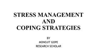 The document discusses stress as both a physiological and psychological response to challenges, noting its potential benefits and harmful effects. In India, stress is a leading cause of mental health disorders, and chronic stress can result in various physical and mental health issues. Effective stress management techniques, such as relaxation practices, exercise, and social support, are essential for improving overall well-being and coping with stressors.