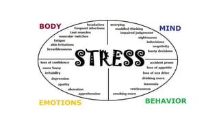 This document discusses stress, anxiety, and strategies for managing them. It defines stress as the body's normal response to threatening events. There are different types of stress like acute, episodic, and chronic stress. The document also defines anxiety as feelings of worry and unease about an uncertain outcome. It notes that stress and negative thoughts can trigger anxiety. Finally, the document provides strategies for managing stress and anxiety, such as exercise, meditation, saying no, altering situations when possible, and accepting things that cannot be changed.