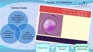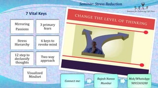 This seminar aims to tackle psychological and physiological stress through understanding the human stress response mechanism and how stress can lead to dysfunctions. It will explore the mind's repair system and mechanisms, identify the 7 vital keys to managing stress like mirroring passions and fears. It will also cover the 12 steps to declassify thoughts and introduce a two way approach to stress reduction using visualization and mindset shifts. Attendees will learn how to scan thinking, supervise emotions, remain unperturbed during onslaughts and find tranquil focus through 5 big benefits of reducing stress.