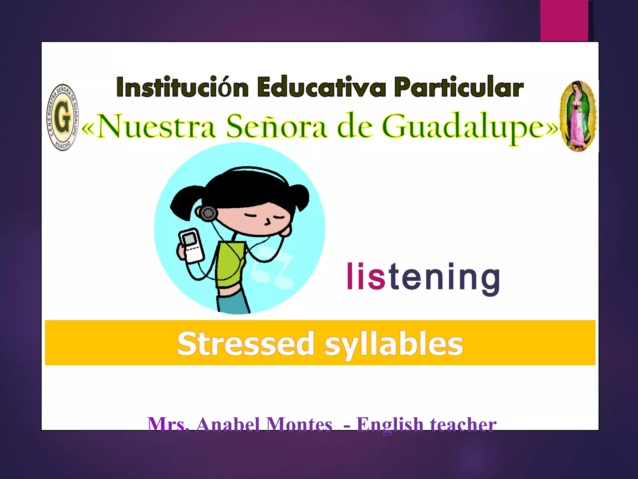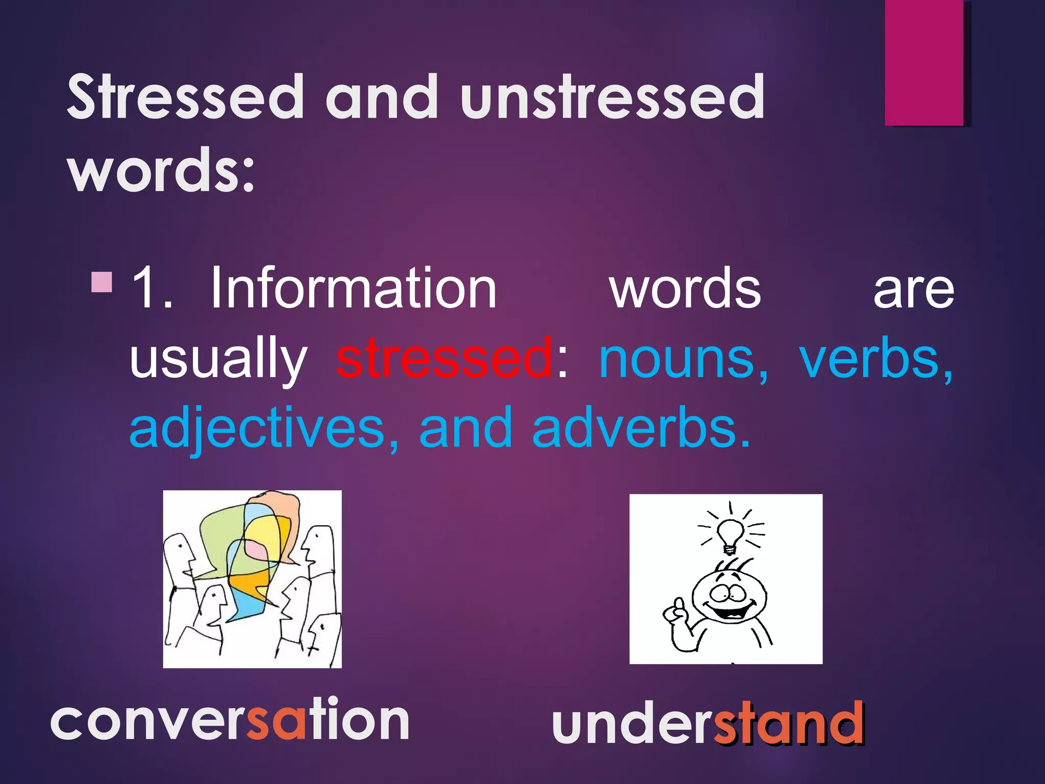 This document discusses stress patterns in English words. It notes that content words like nouns, verbs, adjectives and adverbs are usually stressed, while function words like articles, pronouns, prepositions and conjunctions are usually unstressed. It provides examples of stressed and unstressed words. Exercises are included to have the reader identify stressed syllables and underline them in stressed words.