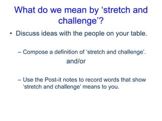 The document discusses the concepts of "stretch and challenge" in learning. It provides examples of lesson activities that effectively stretch and challenge students, such as using higher-level Bloom's verbs in objectives, modeling for students, and giving students choice in activities and presentations. It also discusses factors that can limit learning, such as excessive pace, overloading of activities, and inflexible planning. Suggestions are provided to help teachers plan for effective stretch and challenge, including considering links to primary schools, incorporating challenge into the curriculum, and promoting a love of reading.