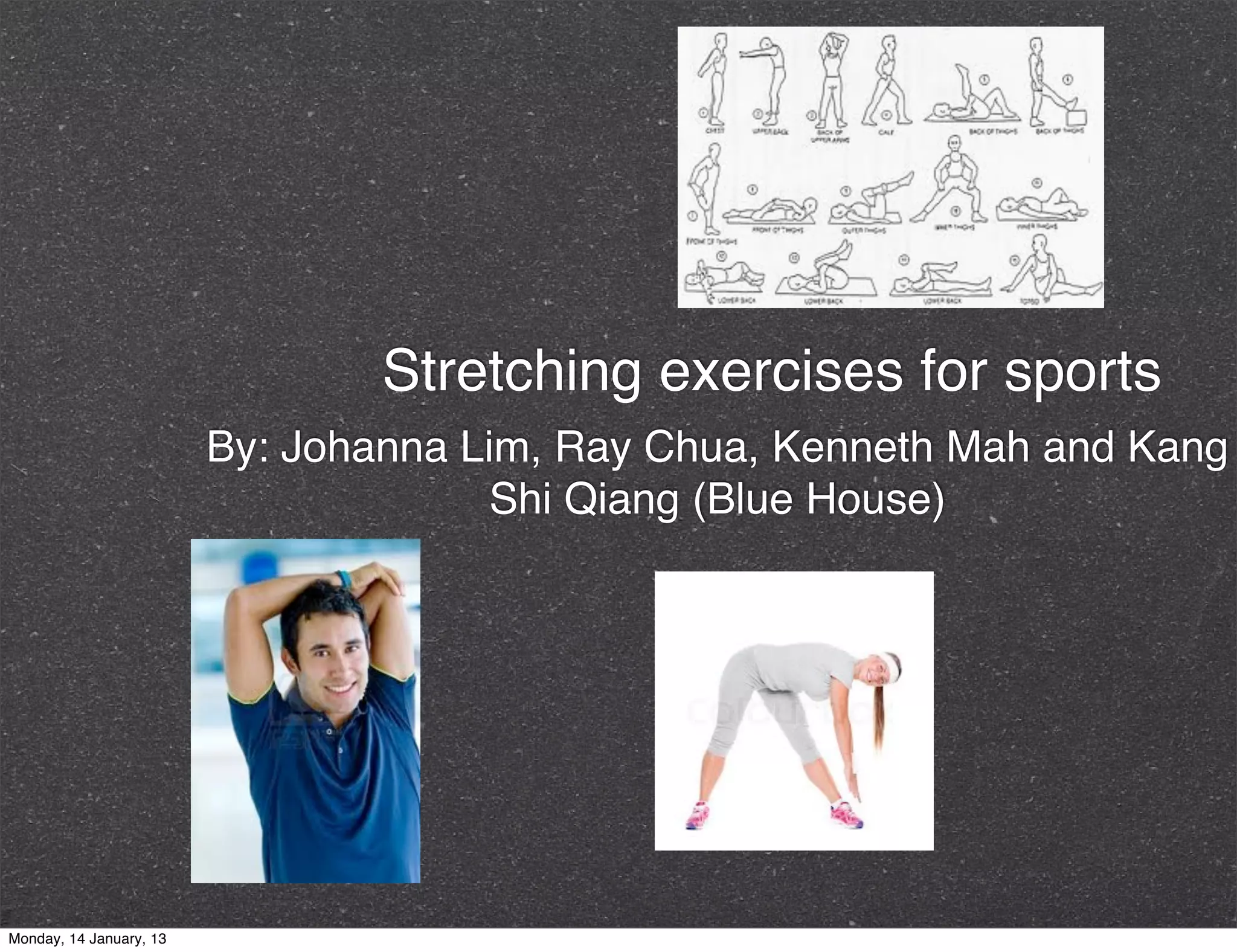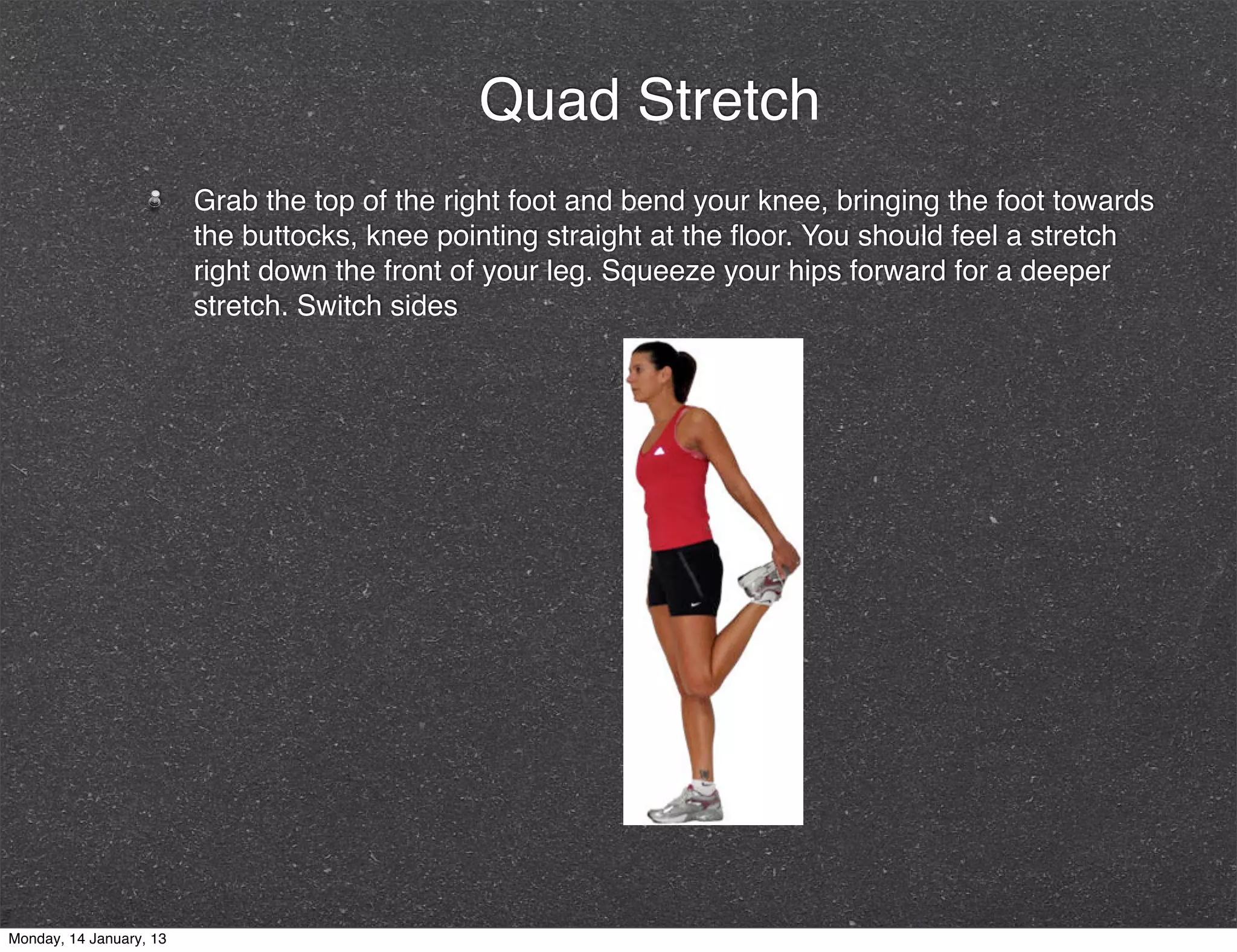 The document describes several stretching exercises for different parts of the body, including the quads, hamstrings, shoulders, triceps, arms, back, neck, inner thighs. Instructions are provided for how to perform stretches for each body part, describing positioning and movements to feel a stretch and improve flexibility.