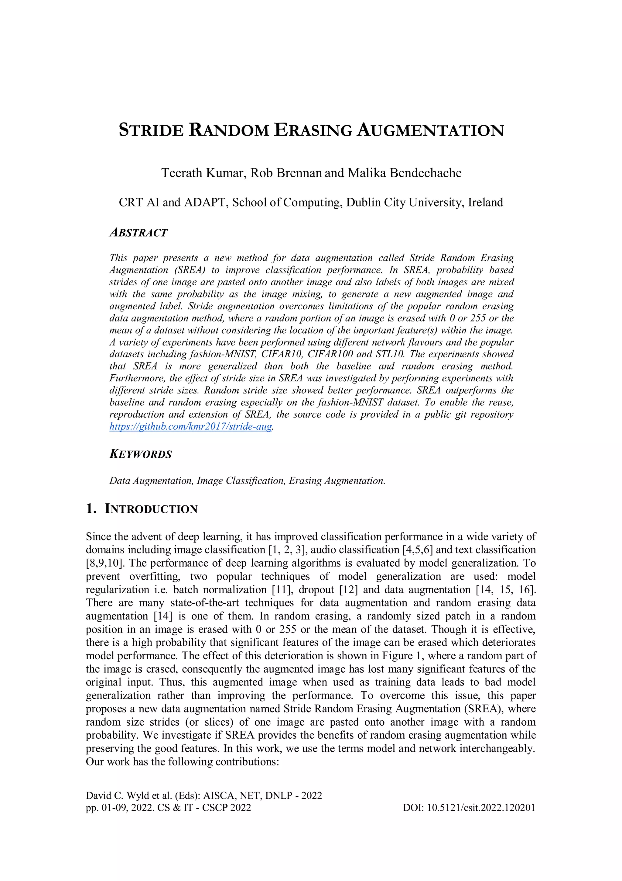 The paper introduces a novel data augmentation technique called Stride Random Erasing Augmentation (SREA) to enhance image classification performance by preserving significant features while mixing images. Experiments conducted on popular datasets like Fashion-MNIST, CIFAR-10, CIFAR-100, and STL10 reveal that SREA outperforms both the baseline and traditional random erasing methods, particularly in preserving model generalization. The source code for SREA is publicly available for further use and experimentation.