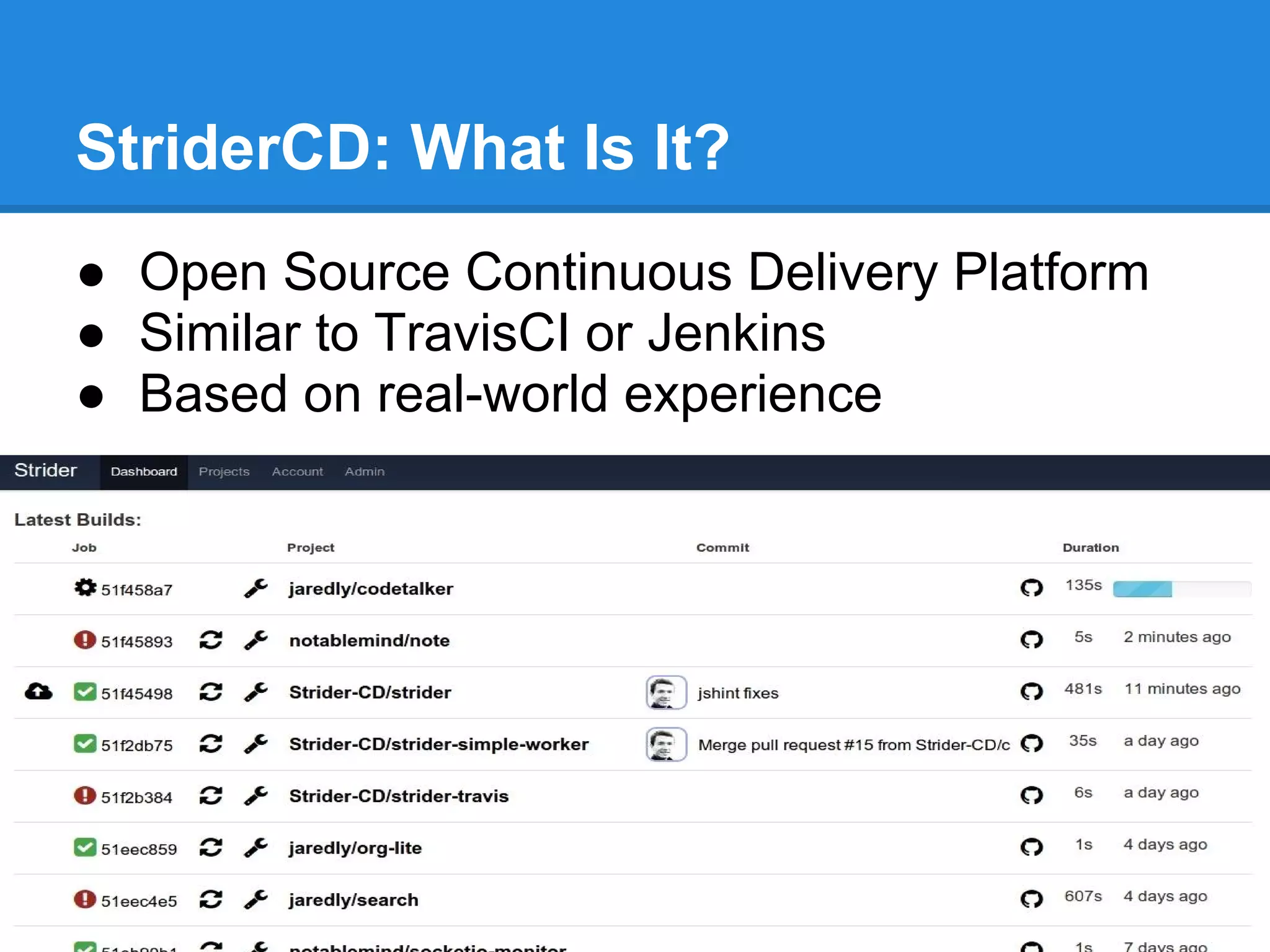 - StriderCD is an open source continuous integration/delivery platform similar to TravisCI or Jenkins.