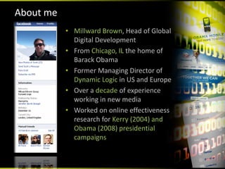 The Obama 2008 presidential campaign utilized new media to build the Obama brand from low name recognition to the presidency over two years. [1] The campaign prioritized new media and staffed it equally with other divisions, gathering a database of 13 million supporters through compelling content on platforms like Facebook, YouTube, email and mobile. [2] Testing, measurement, and optimization were central to the data-driven new media strategy of fundraising, volunteer mobilization, and communicating a focused, consistent message of change. [3] Obama's grassroots, supporter-centered approach revolutionized political new media and helped him become the 2008 Marketer of the Year.