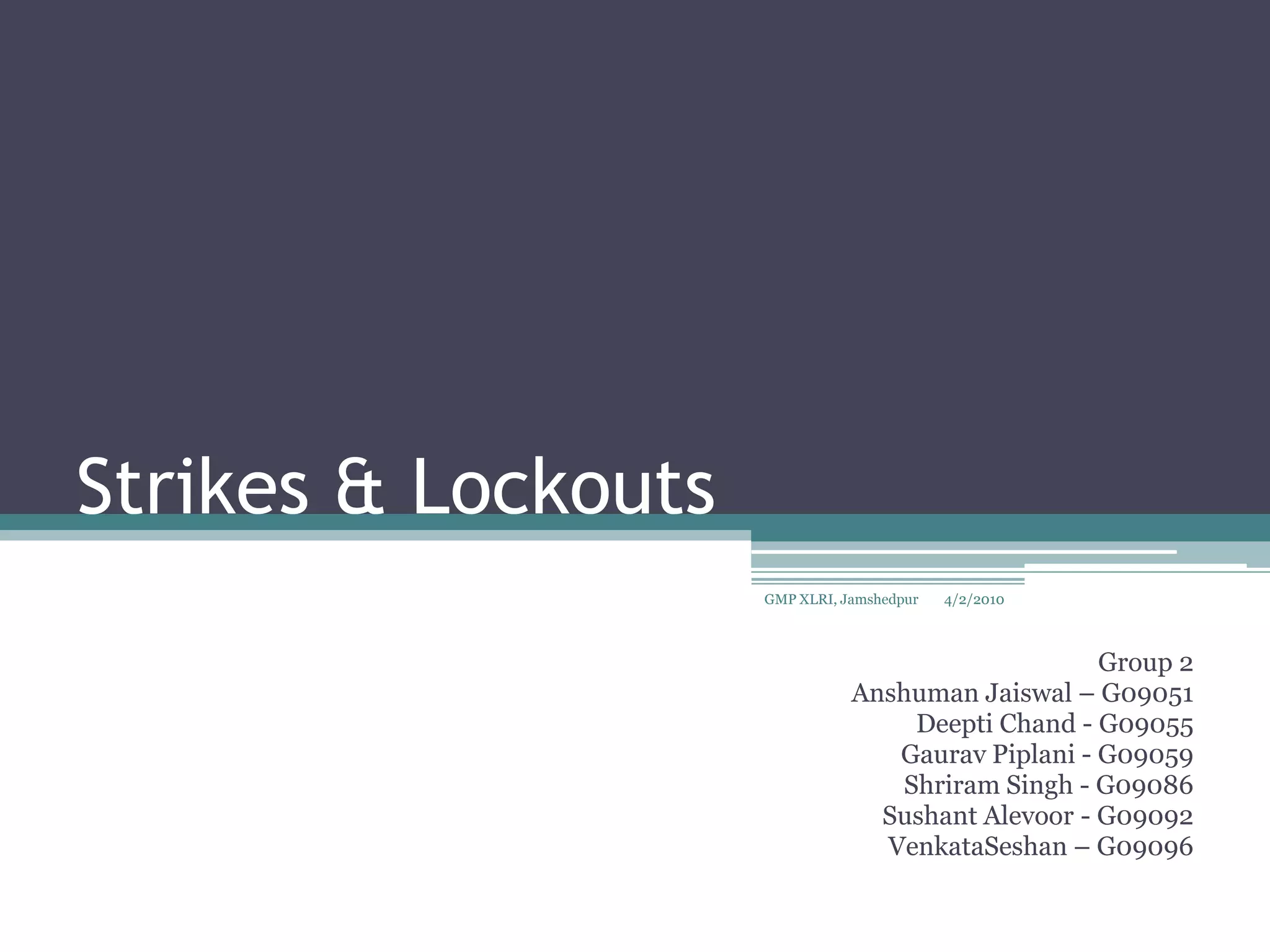 Strikes and lockouts refer to cessation of work by employees or employers respectively. A strike involves a concerted refusal to work or accept employment by employees. A lockout is an act of hostility by employers where work is stopped. Strikes and lockouts can be justified or unjustified based on the facts and circumstances. Indian law places restrictions on strikes and lockouts in public utilities and during conciliation, arbitration or when a settlement is already in place. Illegal strikes and lockouts can result in penalties for employees and employers under the Industrial Disputes Act.