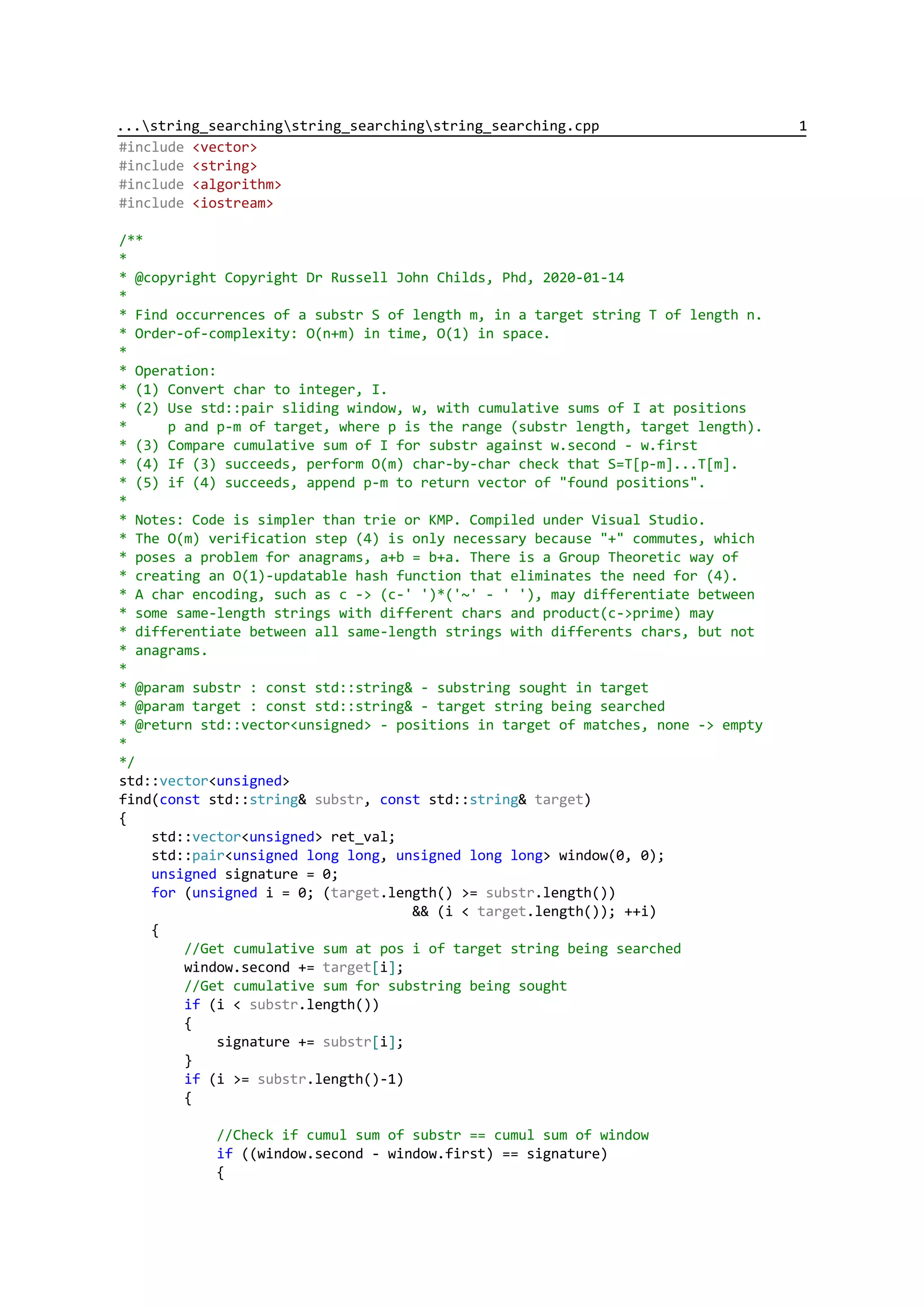 This document presents a C++ implementation of a substring searching function that finds occurrences of a given substring within a target string using an efficient O(n+m) time complexity algorithm. The function utilizes cumulative sums and performs character-by-character verification in case of matching sums to ensure accuracy, especially in the presence of anagrams. The code includes examples that demonstrate the functionality and bounds checks for various cases.