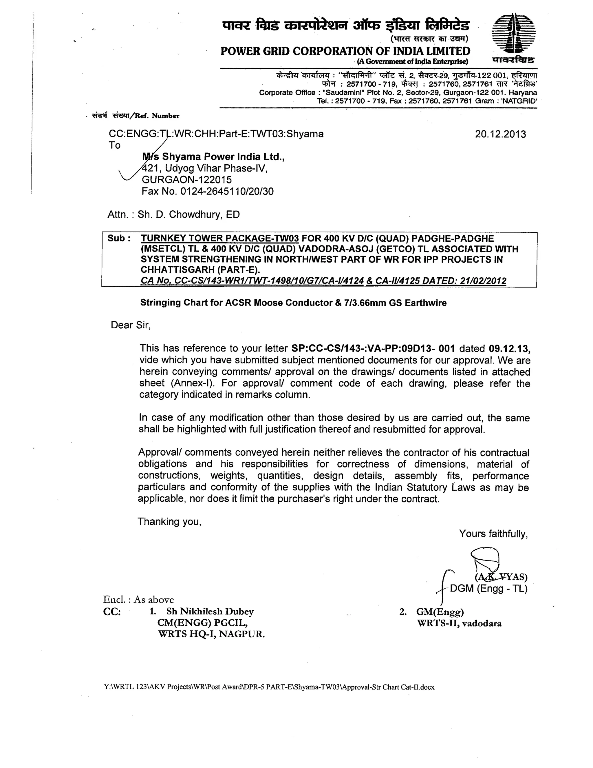 Stringing Chart for 400 KV D/C Quad Transmission line project of powergrid
