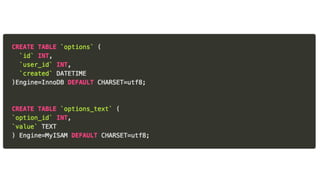 The document discusses data engineering techniques, particularly focusing on altering table structures in databases, such as changing data types and managing large textual fields. It evaluates different database engines like MyISAM and InnoDB regarding speed, reliability, and search efficiency, and highlights the inefficiencies of querying text fields. It concludes that while there is no one-size-fits-all solution, certain implementations can enhance performance and application architecture.