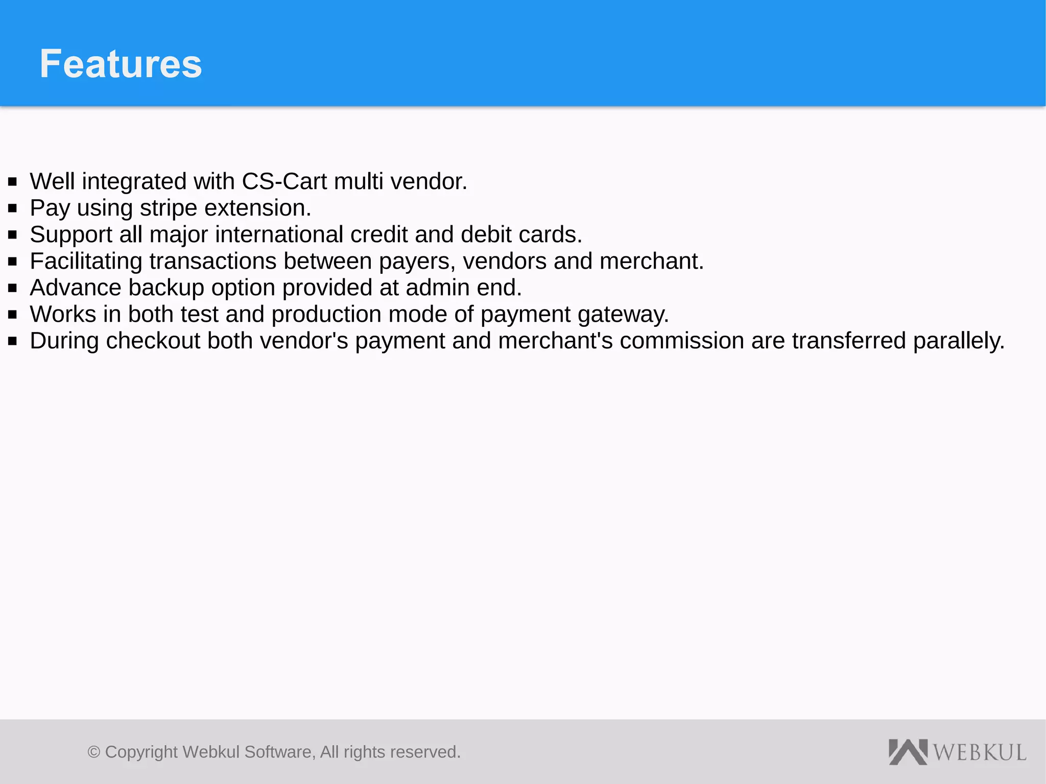 The document describes the Stripe Connect payment gateway, which automates payment processing through secure vendor communication. It integrates well with CS-Cart multi-vendor, supports major credit and debit cards, and facilitates transactions between payers, vendors, and merchants. Additional features include a backup option, parallel payment transfers during checkout, and resources for user guides and demos.