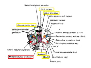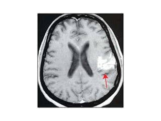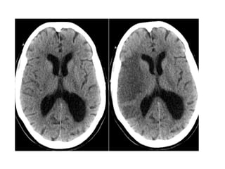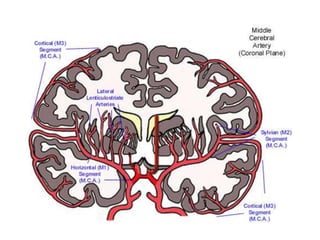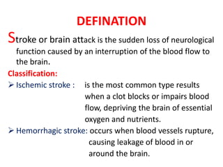 This document defines stroke as the sudden loss of neurological function caused by an interruption of blood flow to the brain. It classifies strokes as either ischemic, caused by a clot blocking blood flow, or hemorrhagic, caused by a ruptured blood vessel. Risk factors include hypertension, atrial fibrillation, and smoking. Symptoms vary depending on the affected brain region but may include weakness, sensory changes, speech problems, and visual issues. Complications can include muscle contractures, seizures, and cardiac or pulmonary issues.