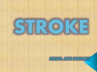 Stroke terjadi ketika aliran darah ke otak terganggu yang dapat merusak atau mematikan sel saraf. Stroke dibagi menjadi stroke iskemik yang disebabkan penyumbatan arteri dan stroke hemoragik yang disebabkan pecahnya pembuluh darah di otak. Faktor risiko utama stroke antara lain hipertensi, diabetes, merokok, dan kolesterol tinggi. Pengendalian faktor risiko serta tindakan segera seperti trombolisis dapat mencegah kerusakan