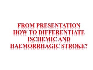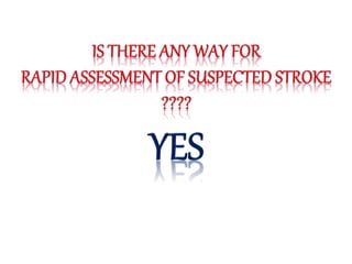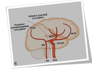 This document defines stroke as a focal brain dysfunction lasting over 24 hours caused by a non-traumatic vascular issue. It then classifies strokes as ischemic (85%) or hemorrhagic (15%) and discusses their risk factors like hypertension, smoking, atrial fibrillation, diabetes, and age. The diagnosis involves examining for weakness, speech issues, vision problems, and performing a CT or MRI scan. Investigations help identify the cause and rule out mimics. Treatment focuses on stabilizing the patient, controlling risk factors, and using thrombolysis, aspirin, or anticoagulants depending on the type of stroke. Lifestyle changes and secondary prevention aims to modify risk and prevent future strokes.