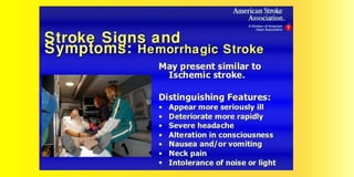 - The types, causes, risk factors, signs and symptoms, and management of ischemic and hemorrhagic strokes.