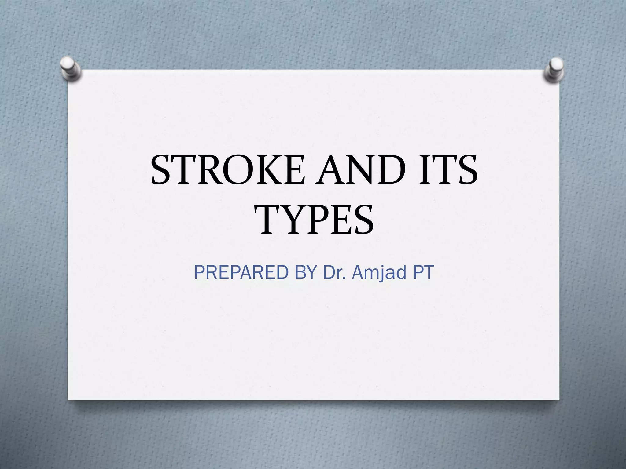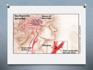 Stroke occurs when blood flow to the brain is interrupted, and there are two main types: ischemic (caused by blockage) and hemorrhagic (caused by bleeding). Stroke is a leading cause of long-term disability and death in the United States. Risk factors include high blood pressure, heart disease, smoking, and diabetes. Treatment depends on the type of stroke, but may involve clot-busting drugs or surgery to repair damaged blood vessels. Rehabilitation is important for recovery and aims to restore functions like movement, speech, and daily living skills through therapies.