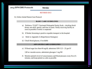 This document discusses stroke assessment for EMS providers. It defines a stroke as a sudden interruption of blood flow to the brain, outlines risk factors like hypertension and smoking, and describes common types such as thrombosis and hemorrhage. Signs and symptoms include weakness, altered mental status, and slurred speech. It emphasizes the importance of rapid assessment using tools like the Cincinnati Prehospital Stroke Scale and urgent transport to treat strokes within 3 hours of onset. Early detection and transport by EMS can significantly impact outcomes for stroke patients.