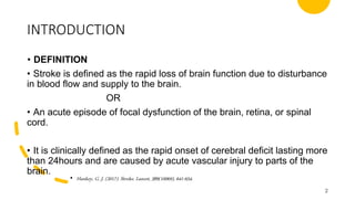 The document provides a comprehensive overview of stroke, including its definition, types, risk factors, epidemiology, pathophysiology, clinical manifestations, and treatment options. Stroke is characterized by the rapid loss of brain function due to disrupted blood supply, with significant mortality and disability worldwide. It outlines both non-modifiable and modifiable risk factors, recent research on causes, and detailed treatment guidelines for various stroke types.