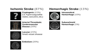 Cerebrovascular accidents (CVAs), commonly known as strokes, are serious vascular events affecting approximately 795,000 Americans annually, leading to 129,000 deaths each year, and are the foremost cause of long-term disability. Strokes can be divided into ischemic (87%) and hemorrhagic (13%) types, with various risk factors and pathophysiological mechanisms contributing to each type, including thrombosis and embolism for ischemic strokes. Early intervention through medications like rtPA or endovascular procedures is critical in managing strokes, emphasizing the importance of recognizing warning signs for timely treatment.