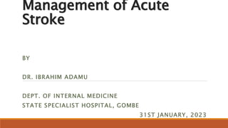 This document provides an overview of the management of acute stroke. It defines stroke and transient ischemic attack, and discusses the epidemiology, classification, risk factors, pathophysiology, clinical presentation, diagnosis, management, complications and prognosis of stroke. The management involves resuscitation, reperfusion therapies like thrombolysis and thrombectomy, treating complications, secondary prevention including blood pressure and diabetes control, and rehabilitation. The document emphasizes the importance of specialized stroke units and timely management to improve outcomes for patients with acute stroke.
