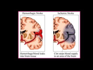 A stroke occurs when the blood supply to part of the brain is disrupted, depriving brain cells of oxygen. There are two main types of stroke: ischemic, caused by a blockage, and hemorrhagic, caused by a ruptured blood vessel. Symptoms vary depending on the affected brain region but may include numbness, weakness, vision problems, confusion, and trouble speaking. Immediate treatment involves calling emergency services, monitoring the person's condition, and preventing movement until medical help arrives.
