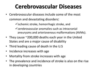 Cerebrovascular diseases like stroke are a major cause of death and disability in the US. There are two main types of stroke - ischemic caused by blockage of an artery and hemorrhagic caused by bleeding. Risk factors include age, hypertension, diabetes, smoking, prior stroke or TIA. Diagnosis involves brain imaging like CT or MRI. Treatment depends on type and severity but may include thrombolysis, anticoagulation, antiplatelet drugs, managing risk factors, and rehabilitation. Preventing stroke requires risk factor modification and treatments like antiplatelet drugs.