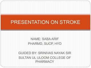 The document presents a comprehensive overview of strokes, including their definition, types (ischemic, hemorrhagic, and transient ischemic attacks), risk factors, and pathophysiology. It outlines the clinical presentation, complications, diagnostic methods, treatment goals, and both non-pharmacologic and pharmacologic therapies for managing strokes. Additionally, it discusses patient counseling and preventive measures to reduce the risk of stroke.