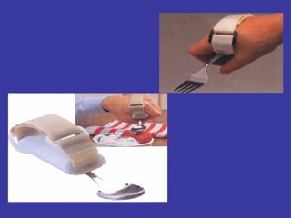 3. Additional challenges include spasticity, cognitive issues, incontinence, and depression. Treatment involves positioning, stretching, splinting, medications, and assistive devices. Regular evaluation monitors patient progress.