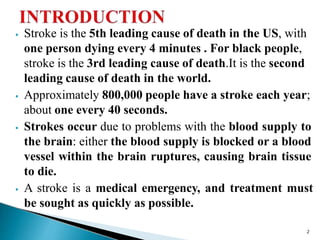 Stroke is the 5th leading cause of death in the US. There are three main types of stroke: ischemic, hemorrhagic, and transient ischemic attacks (TIAs). Ischemic strokes, which account for 85% of cases, occur when a blood clot blocks an artery supplying blood to the brain. Hemorrhagic strokes occur when a brain artery ruptures due to conditions like hypertension. TIAs are temporary and cause no permanent damage but indicate risk for future strokes. Symptoms of stroke appear suddenly and include face drooping, arm weakness, speech difficulties, and severe headache. Diagnostic tests help determine the type and location of stroke. Lifestyle changes and medical treatment can help prevent strokes.