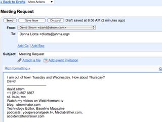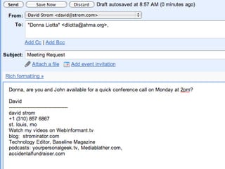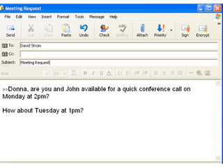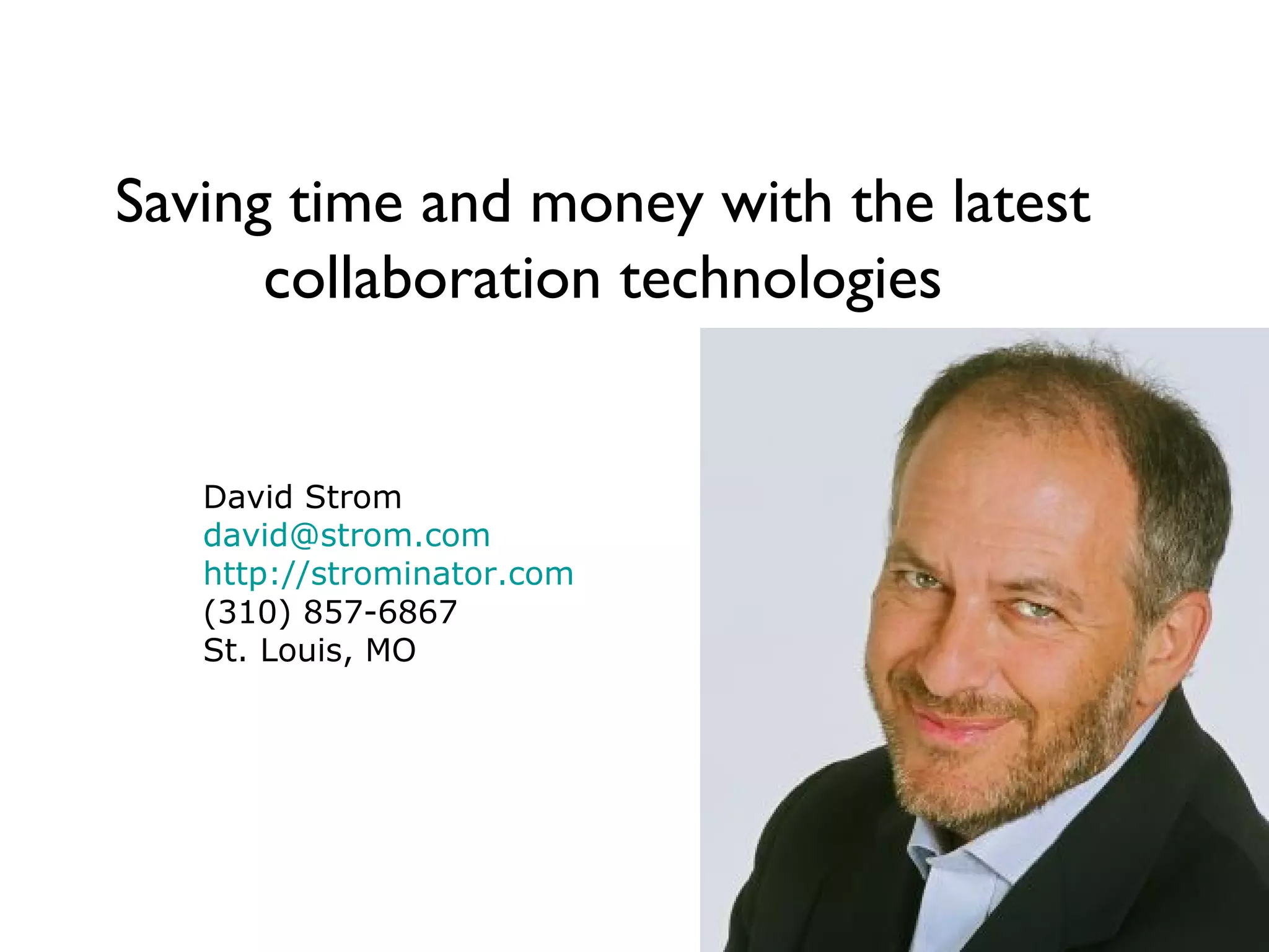 This document discusses how companies can save time and money by using modern collaboration technologies instead of relying solely on email. It provides examples of tools that can be used for tasks like scheduling meetings, sharing documents and spreadsheets, communicating with customers, and more. The document advocates starting with one collaboration tool to try it out, such as using Twitter, setting up blogs/wikis, or sharing documents, rather than attempting to adopt all tools at once.