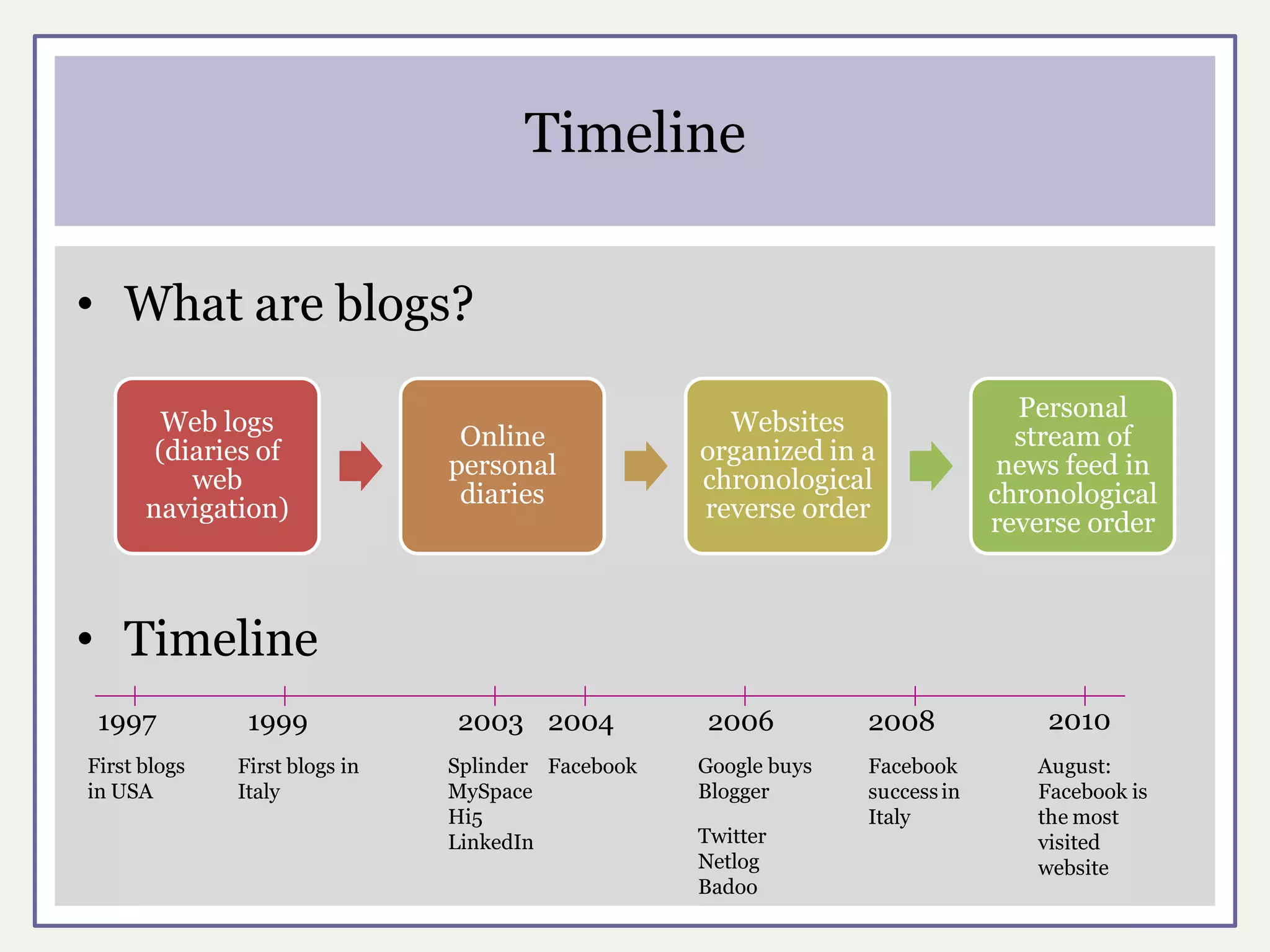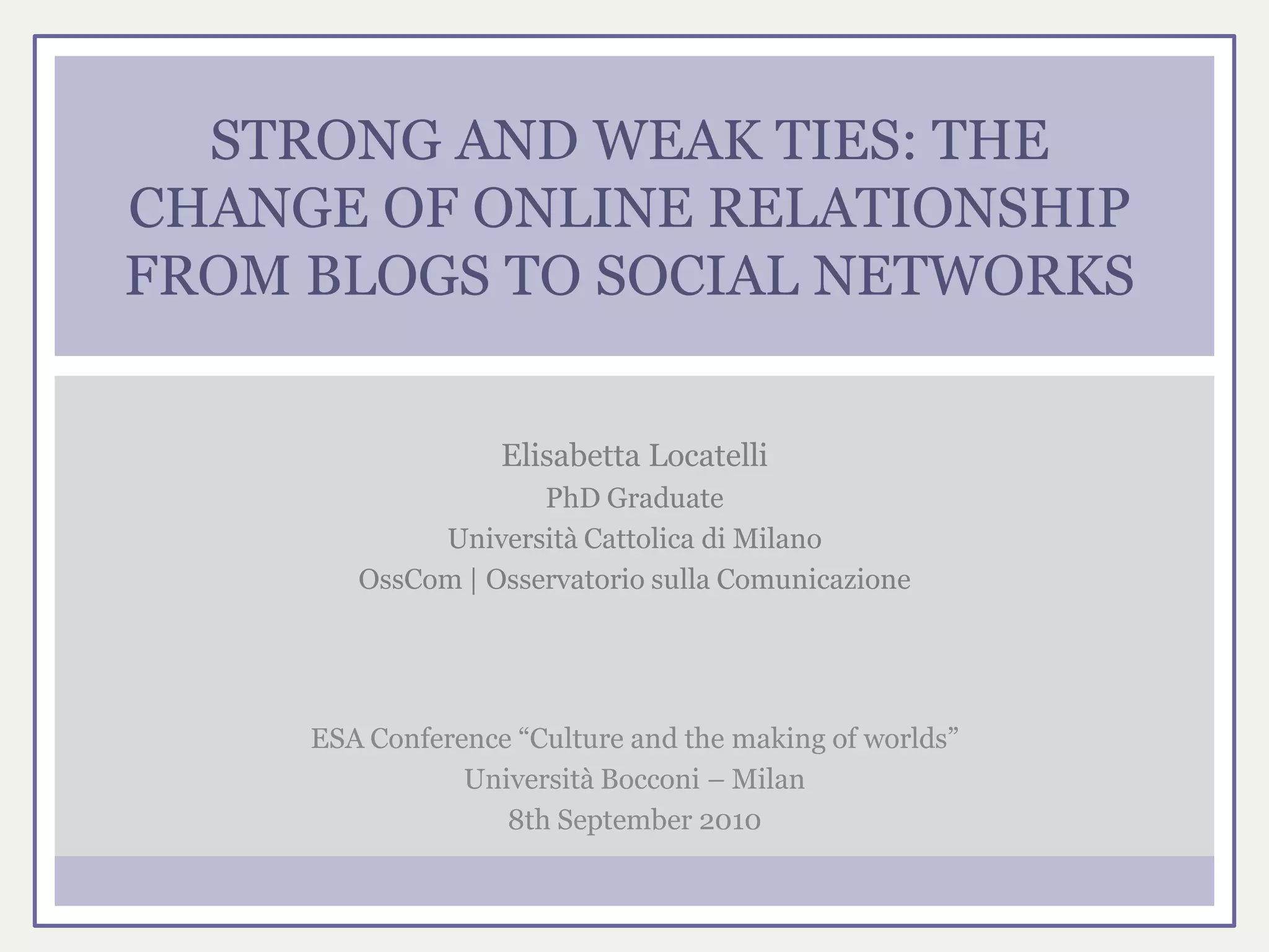 The document discusses the evolution of online relationships from blogs to social networks, highlighting the blending of personal publishing with social connectivity. It emphasizes the varying nature of interactions on these platforms and presents a qualitative methodology examining personal blogs and social relationships among young adults in Italy. The findings illustrate shifts in online social dynamics, underscoring the importance of social capital and the interplay between online and offline interactions.