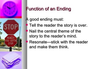 The document discusses the importance of strong endings in stories. It states that a good ending must tell the reader the story is over, nail the central theme to the reader's mind, and resonate or make the reader think. A really good ending can also surprise the reader, present a twist, or do something unexpected. When writing the ending, the author should have it in mind from the start and use it as an opportunity to influence the reader. Common weak endings to avoid are ones that simply state the character went home or woke up to find it was a dream. Strong ending techniques include using a memory, feeling, decision, wish or defining moment that results from the main event of the story. The ending is important because it
