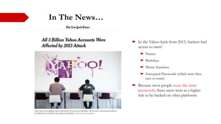 In 2013, hackers accessed Yahoo user accounts and were able to easily crack encrypted passwords because many people reuse passwords across multiple accounts. The document outlines guidelines for strong passwords that are at least 8 characters long and include a mixture of uppercase and lowercase letters, numbers, and special characters. It also recommends using a password manager to store unique passwords for each account, but ensuring the password used to access the manager is very strong. Regularly changing passwords and using multi-factor authentication provides additional security.