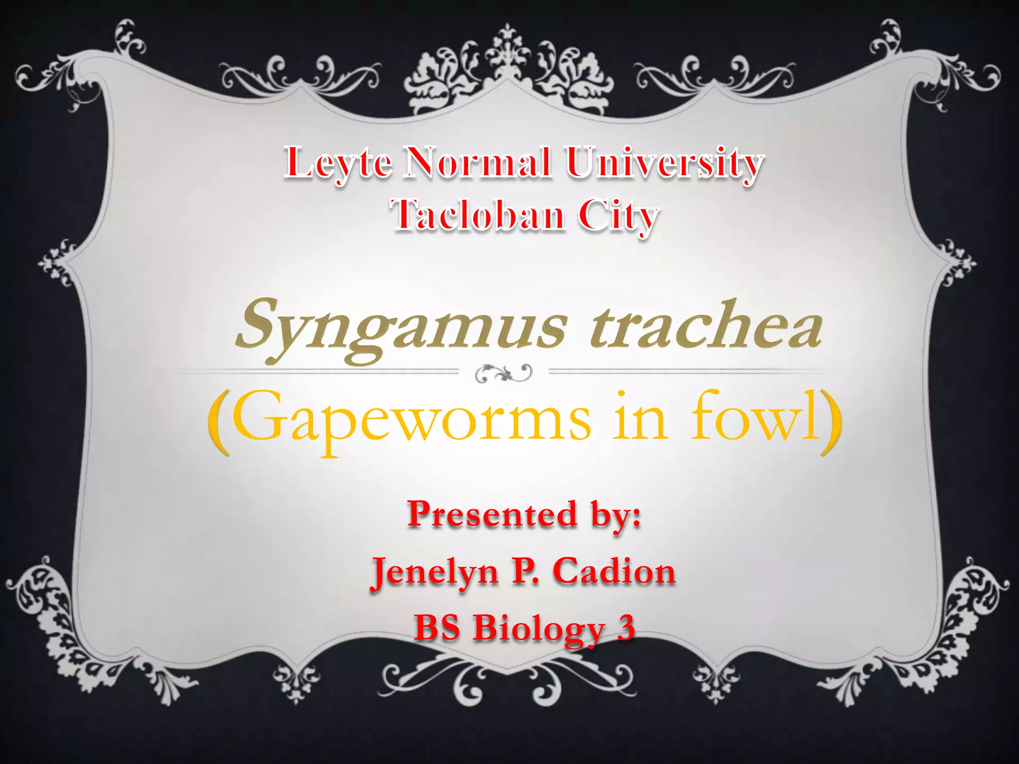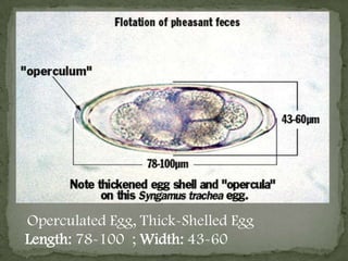 Syngamus trachea, commonly known as the gapeworm, is a parasitic nematode that infects the upper respiratory tract of birds. It has a complex life cycle involving an intermediate host such as an earthworm or snail where it encysts. Adult male and female worms are permanently joined in a Y-shape in the trachea of birds. They lay eggs that pass in the feces and hatch inside or outside the host. Clinical signs in infected birds include weakness, emaciation, and breathing difficulties as the worms cause tracheitis and pneumonia. Diagnosis is made by finding the characteristic eggs in feces or adult worms in the trachea during necropsy. Treatment involves deworming medications and controlling