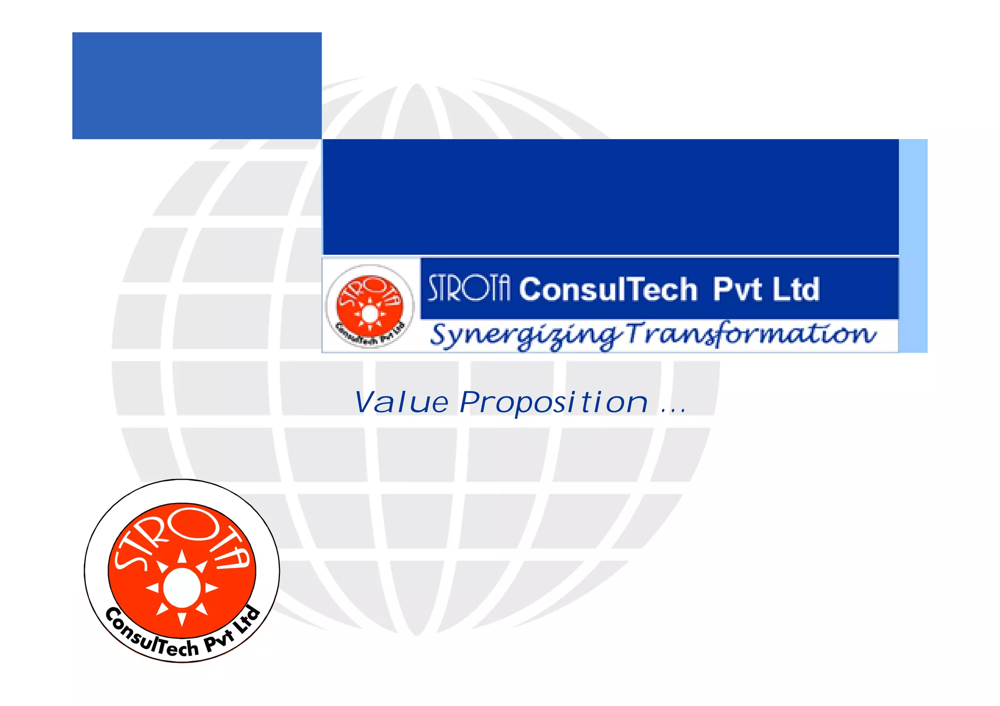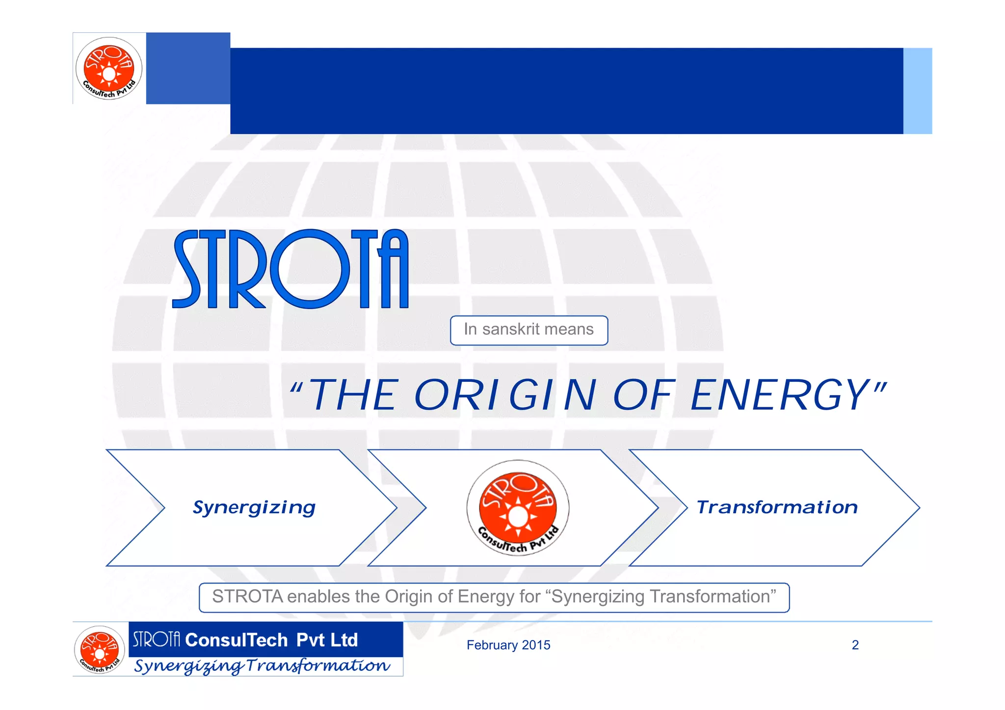 STROTA enables synergizing transformation through igniting minds, enabling people, enhancing processes, providing apt tools, validating business models, enforcing governance, and an outcome based model with intellectual strength, connection in ecosystems, and open mentorship from idea to execution. STROTA's offerings focus on innovation, efficiency, readiness, lean processes, technology alignment, enhanced products and markets, and aligned organizations.