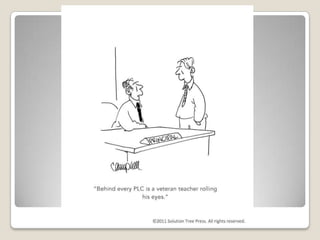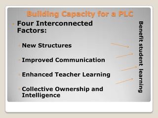 The document outlines the principles and structures of a Professional Learning Community (PLC) focused on enhancing student learning through collaboration among educators. It emphasizes shifting the focus from teaching to learning, implementing systematic responses for students who struggle, and fostering teamwork to improve educational outcomes. Key elements include critical questions for assessment, collaborative norms, and commitments from both administration and teachers to support the growth of all students.