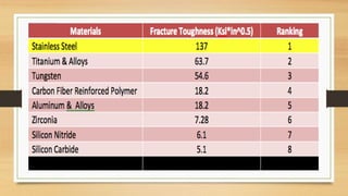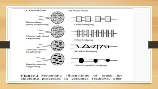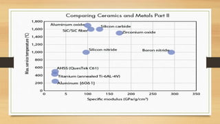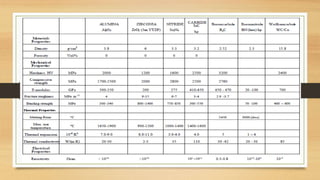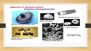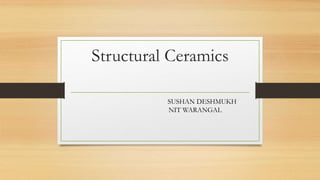 This document discusses structural ceramics, including their mechanical properties, classifications, general properties, processing techniques, and areas of application. It describes how structural ceramics are used in applications requiring properties like strength, hardness, heat resistance, and chemical inertness. Examples given include wear parts, cutting tools, engine components, armor, semiconductor production equipment, steel making, and catalytic converters. The document provides details on the materials used and processing methods for different applications of structural ceramics.