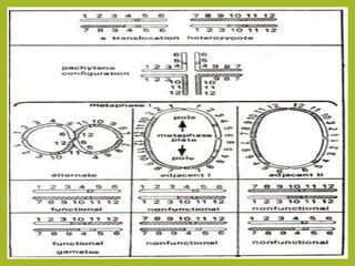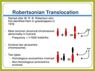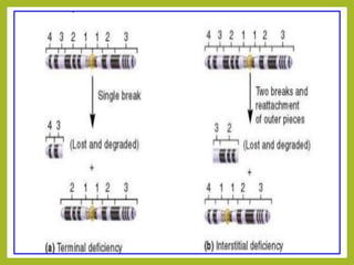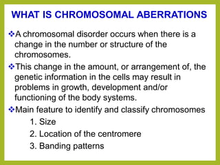 Chromosomal aberrations refer to changes in chromosome structure or number that can result in genetic disorders. The document discusses several types of chromosomal aberrations including numerical abnormalities like aneuploidy and structural abnormalities like deletions, duplications, inversions, and translocations. Deletions occur when a segment of a chromosome is lost, duplications when a segment is repeated, inversions when a segment rotates 180 degrees, and translocations when a segment is transferred to a non-homologous chromosome. These aberrations can impact fertility, gene expression, and viability and have been implicated in genetic disorders and evolution. The document provides detailed explanations and examples of each type of aberration.